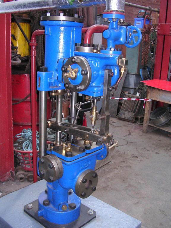 These three pictures show the steam powered high pressure air compressor, and the two Weir Feedwater Pumps. (Also shown is a colour picture of a smaller version of the Weir pump just to give a better view of what they look like). The top portion is the Steam Engine as it were, and the bottom portion is the actual water pump.