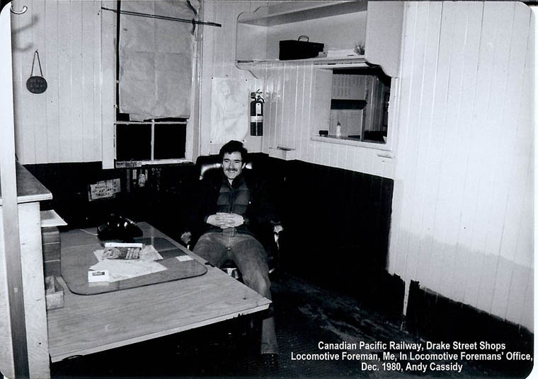Locomotive Foreman/Engineers Booking-In-Room building that was east of the roundhouse in the servicing area. Yours truly sitting in the outside office. By this time it was just a glorified sitting area, and if it wasnt for the phone, I wouldnt be there. Just to my left was where we had the Yard Unit Scheduling Board, but it was removed and put into the current office of the day which was moved to the old Electrical Foremans office west of the roundhouse. Behind me in the picture is the pass-through to the Engineers locker/booking in room. By this time there were none checking in or out.