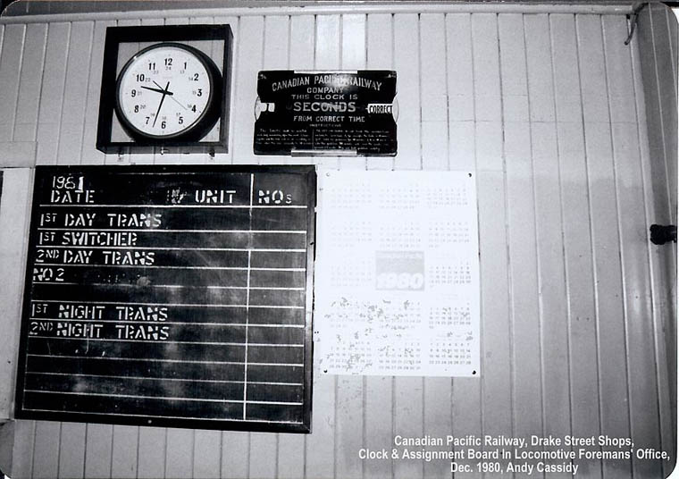 Here you can see the clock, the clock correction board, and the power assignment board which was out of date by this time as all of the passenger and road switcher assignments were long gone. The clock correction board was very important in the old days, as everybodys watch had to be precise. So that board indicated any error of the current clock reading, and the Engineers checked that against their own watch.