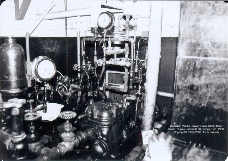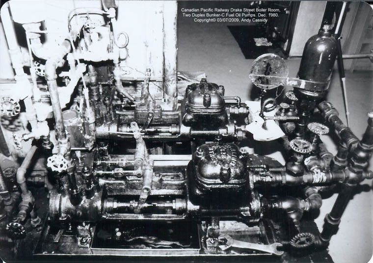 These two photos (above and below) are the Steam Powered Duplex Pumps used to supply Bunker-C to the boiler. Prior to using bunker, the boiler used coal as fuel, but that was before my time there. In any event, bunker was supplied to us by tank car. Only one was in place at a time, and that was placed in the #1 stall of the roundhouse. Steam was connected to the car to heat the oil so it could be pumped, otherwise it is just black tar. (When cold out it was like rock). Once heated up to 170 degrees or so, it was pumped from the car into a storage tank located outside the boiler room, and that tank was also heated by steam. The pumping was accomplished by a larger set of duplex pumps located outside by the tank.