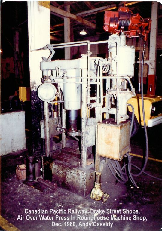 Press we had in the machine shop portion of the roundhouse. It used air to pump water from a reservoir into the press cylinder. You can see the pump on the right side under the red jib hoist there. Primitive, but very effective.