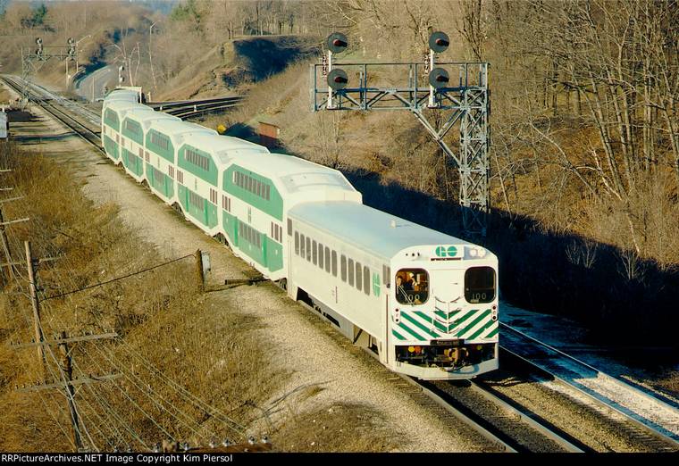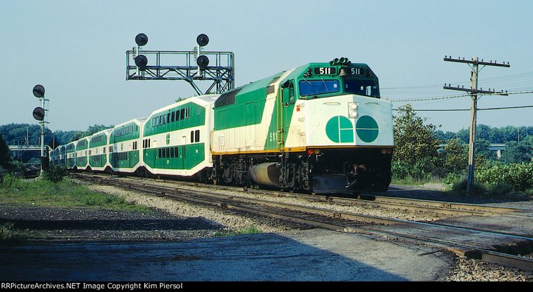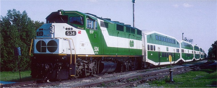 562 at Scarborough, Mile 61.0 Uxbridge Sub. junction with the CN Kingston Subdivision M.325.2. 2/08/2022 Three decades later than the photo below of 534 nothing has changed! Still a 6 bi-coach consist hauled by a F59PH!