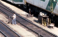 507 (CN 8517 behind) Note switchtender in white shirt and his underground hut! Cabin D 7/09/1979 Lightweight coaches and self-propelled cars built by Hawker-Siddeley in Thunder Bay.