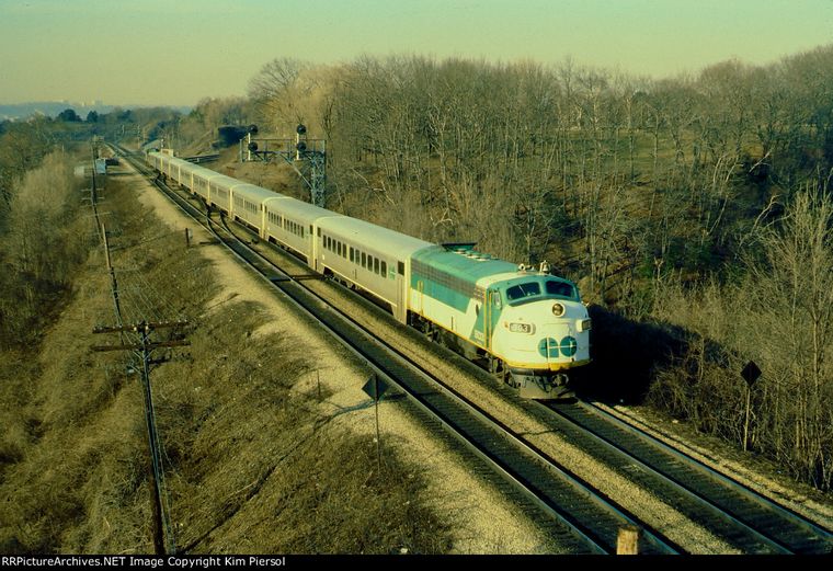 Subdivision just inside the TTR limits. 7/30/1987 The train itself is interesting for its power. 726 (ex RI 3000, nee 381 EMD 32607 1/1967) is a GP40-2 last of seven units rebuilt from a GP40. The last two of these upgraded rebuilt units were trapped in the bankruptcy of the famous Rock Island road. Chrome Crankshaft acquired the Rock Island's Silvis shops along with these seven units and finished them. GO bought all seven units numbering them 700-726 ex RI 3000-3006 not in order. 726 went into GO service 8/1982. The B unit is not really a locomotive at all. It is a unique APU unit one of three (800-802) ex NP EMD B units converted to Auxiliary Power Unit with GM 12 cyl diesel engine to provide hotel power to the train. GO already had eleven APCU's converted A units as Auxiliary Power Control Unit used in place of cab control coaches. All were traded in 1993 to GMLG (General Motors Locomotive Group) on new F59PH 562-568 the last of 49 GO units of this model. 726 became GMTX 201 lease unit after being overhauled and modified by Precision National Corp. equipped with dynamic braking, larger fuel tanks and 65 mph gearing. It became LLPX (Locomotive Leasing Partners) 3204 and all were leased 2002 to St. Lawrence & Atlantic. 3204 went off lease April 2004 and was returned as LLPX 3204. Note: EMD and GATX owned LLP 50/50 from start in 1995 until GATX Rail acquired 100% in 12/2004. This brought GATX Rail's lease fleet to 750 units including LLP's 486 units.