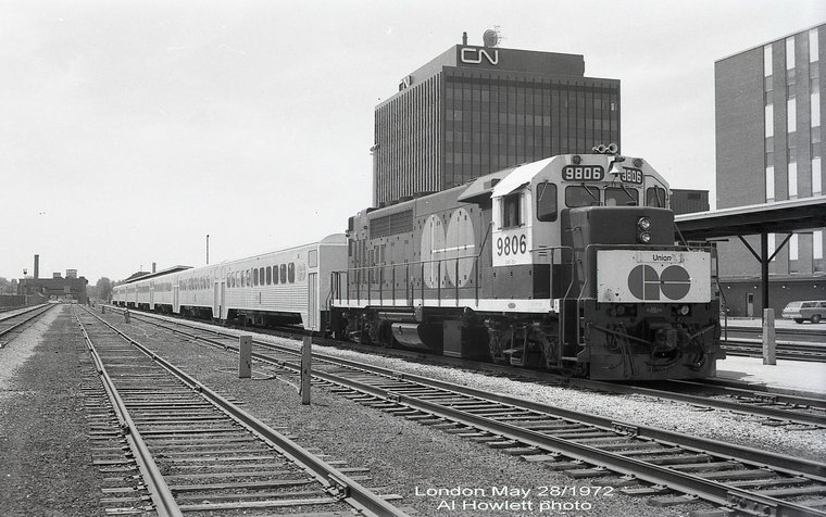 9832 with a rare mixed consist of unilevel and bilevel coaches. Dundas Sub. in left foreground. Compare this angle of same location with one above with engine 511.