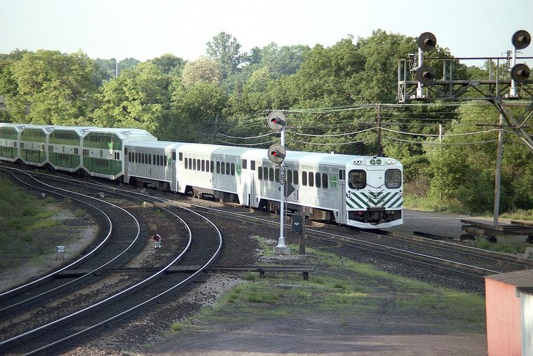 Cab car 103 leads short consist of Bi-Level coaches westbound