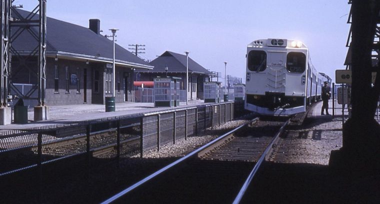 Train westbound to Oakville at Danforth. 1968 Steve Munro Note: Shadow is caused by Main Street bridge.