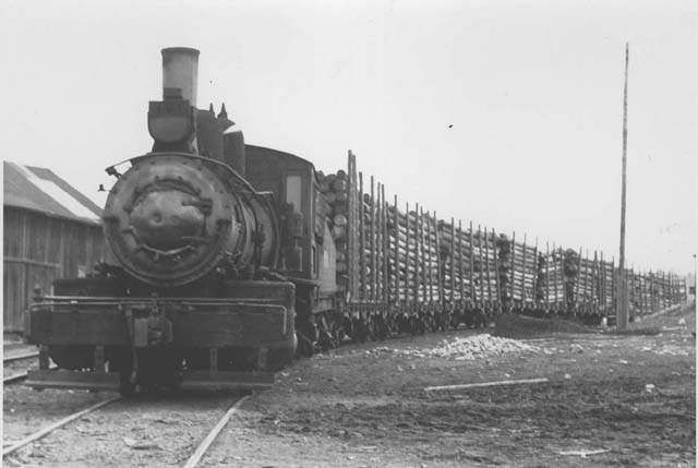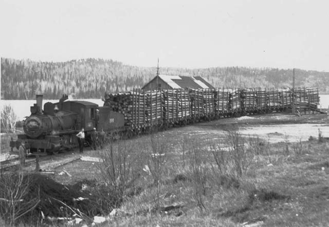 Logs were loaded at Bertrand's on the CPR Heron Bay Subdivision and brought to Dalton on the CPR White River Sub. Shown (above and below) arriving at Dalton Mills, three miles south of the CPR, June 1, 1947.