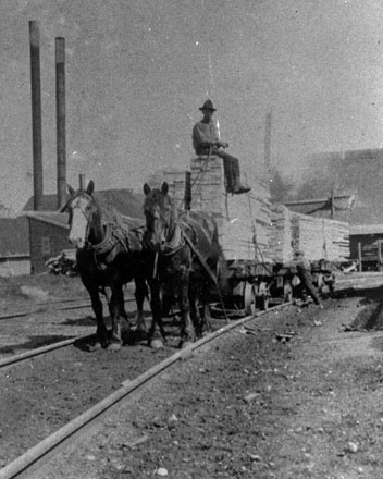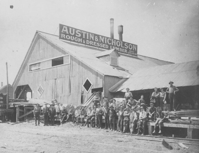 In the spring of 1903 Austin and Nicholson began construction of their first mill, on a point of land between Windermere Lake and the CPR, 22 miles west of Chapleau. The town of Nicholson developed at this site including boarding houses, cottages, warehouses and other structures necessary to support the logging operations of the company. Lumber from the Nicholson mill was stored on the outer edge of the peninsula. A horse was used to draw the fresh cut lumber out to the piling grounds, where it was required to season for several months to a year. The rails to the lumber storage area were inclined so cars placed for loading, with release of the brakes, were allowed to coast back towards Nicholson Siding for pickup. Ties from the mill were loaded directly onto waiting cars for immediate delivery.
