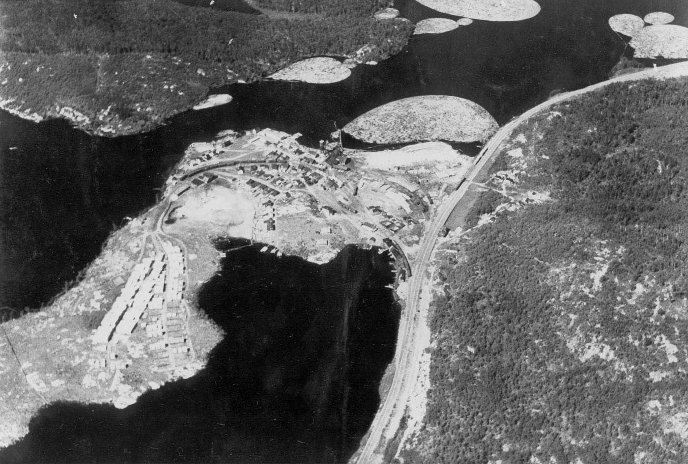 Two horsepower switcher hard at work! A planer was added to the mill in 1914 and the mill was reconstructed the following year. Sometime after 1921 a new planing mill was erected separate from the sawmill. In 1920 the company began to plan for a second mill to satisfy CPRs increasing demand for sawn ties. A new creosote plant was being established exclusively for the CPR. It was located along the Webwood Sub. 2 miles west of Sudbury. Dalton, 21 ½ miles west of Nicholson, had been the site of earlier axe-tie loading operations. The new plant at Dalton Mills was located on Shikwamkwa Lake, 3 miles south of the CPR and linked to it with a private railway. The lumber storage yard along side of the CPR main line had a capacity of up to 50 million feet. In order to meet CPRs insatiable demands for sawn ties to supply the new creosote plant, Austin, Nicholson Ltd. added two portable mills in 1924. Contractor Dan Eaton of Chelmsford set up one mill at Sultan, while the Coles of Pakesley contracted for the company with a mill at Bertrands Siding, near Mobert, on the Heron Bay Sub. This mill was poorly managed and taken over as a company mill. The Devon mill, purchased by Austin and Nicholson in 1921, was organized as the McNaught Lumber Co. division. It operated at its original location, six miles east of Chapleau, until it closed in 1927, when it was dismantled and moved to Sultan. Aerial