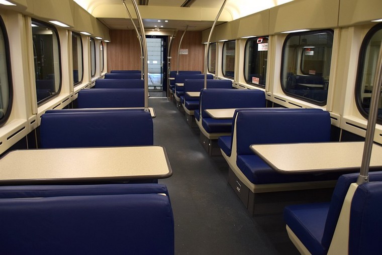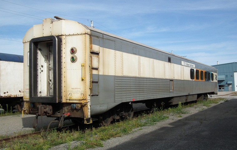 701 dining car (1985 ex GO 9826 nee D-701) H-S 1967 Cochrane shop. August 24, 2019 Mike Robin New program of 14 rebuilt cars for Polar Bear train. Originaly built 1967 by Hawker-Siddeley for GO Transit.