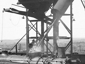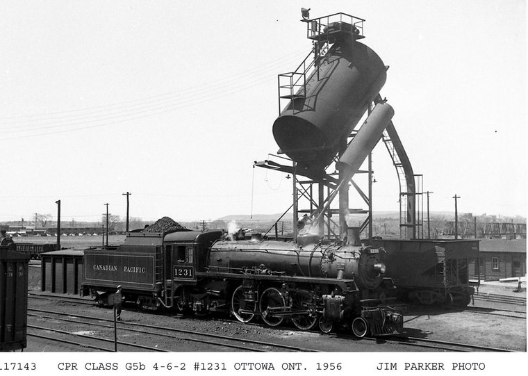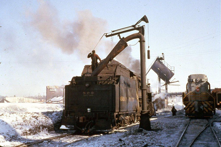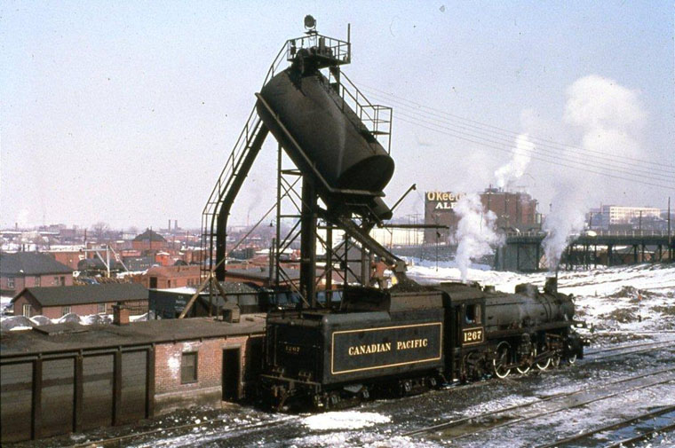 1267 coaling up at new style chute next to sandhouse. This cylindrical coal tower was installed sometime prior to Summer 1954. This style tower designed by E.P.Snow was also at various other locations in the early 1950's including Orangeville.