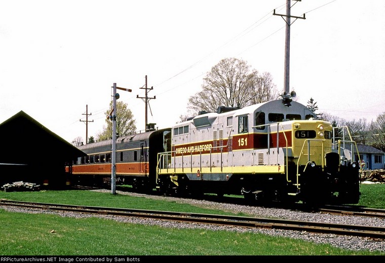 OHRY 151 hauling tourists at Newark Valley, NY 5/01/1993 GP9 GMD A930 4/1956 Sold 6/1991 to Century Locomotive, Montreal. RLK 4205 (nee QNSL 151) acq. 1997 for Ottawa Valley and later transferred