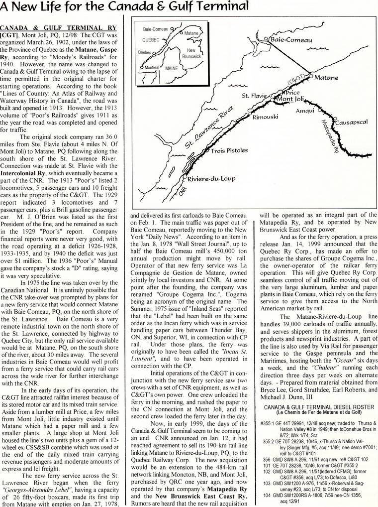 Canada and Gulf Terminal Chemin de Fer de Matane et du Golfe Preservation Tourist operation CGT 355 44-ton GE 29991 12/1948 Bytown Railway Society Archives Note: Traded 7/1949 for Thurso and Nation Valley 5 (Demo 7001 first 70-tonner) GE 28238 5/1946 CFMG 102 Mont Joli, QC 8/15/1969 Canada and Gulf Terminal 504 combine on mixed train. Mont Joli, QC 8/15/1969 All photographs: Wendell Lemon