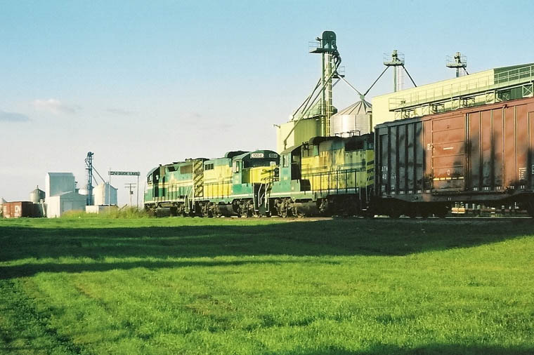 Nice going away view of the train passing grain facilities. Note the absence of trailing unit.