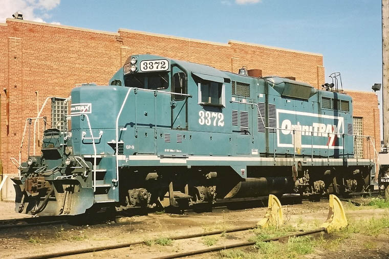 OMLX 3372 a GP9E ex SP 3372 nee T&NO 405 EMD #19466 5/1954 Prince Albert, SK August 6, 2004 Note the half moons. A once common type of stop block. These actually made rerailing more difficult as the truck would turn at an angle. If there was nothing the wheels would simply drop off the rail and could often be pulled back easily.