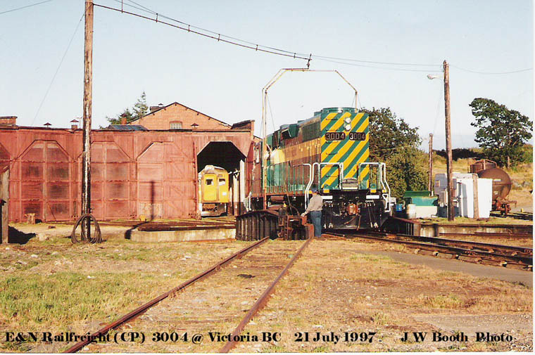E&N 3004 GP38 getting turned on the table for return trip. VIA RDC in roundhouse. Victoria
