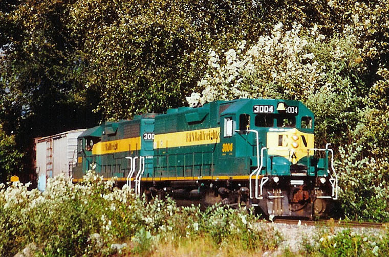 E&N Railfreight 3004 and 3005 GP38's in Macaulay a scenic location in BC that might well have been on Vancouver Island but is actually Coquitlam on the mainland. September 5, 1999 nine months after the internal shorltine was dissolved and it became a Rail America shortline. Note: These were the only two units painted for E&N Railfreight.