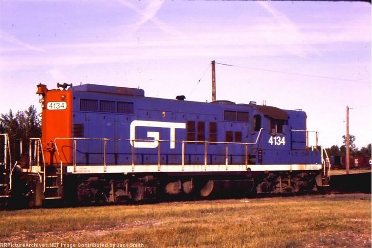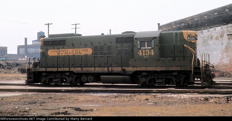 GTW 4134 in an unusual paint scheme. EMD 24964 11/1958 Elsdon Yard, 50th and Kedzie, Chicago, IL 12/31/1964 Note: 4134-4139 built with 83 mph gearing. Later regeared to 65 mph.