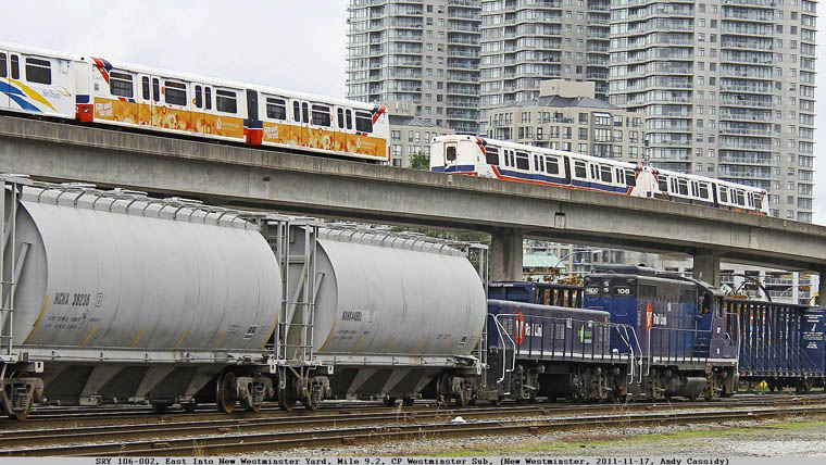 train at the CN transfer yard in New Westminster. Note: Scroll down to years earlier view of 122 with slug 001 a SW900 cut down.