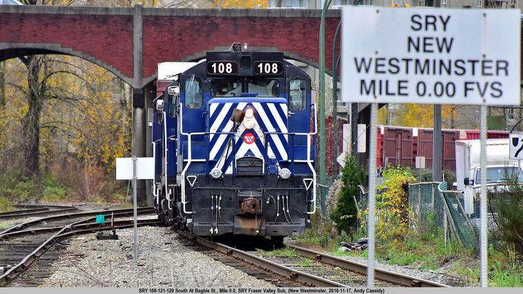 129 ex MRL 129, ex CNW 4376 nee SLSF 512 GP7 EMD 9912 6/1950 New Westminster October 5/2007 Mother 135 with cab control slug 121. Working near Trapp Yard under Queensborough bridge. 1/21/2018