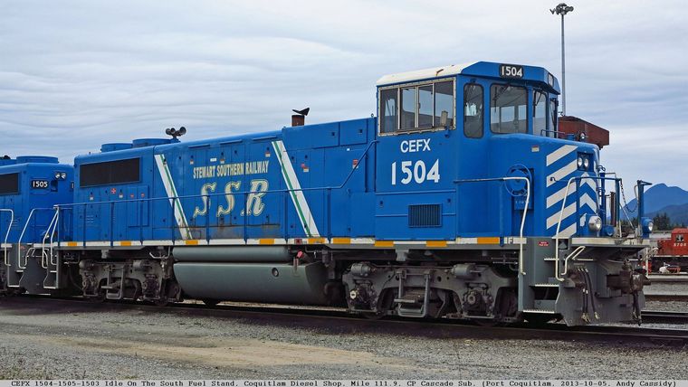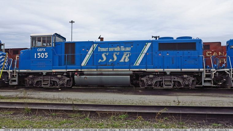 CEFX 1504_1505_1503 returning from SSR. CP Coquitlam diesel shop. 10/05/2013 Andy Cassidy MPI/EMD GP15D 1500 HP Caterpillar Note: Only 20 of these units built. 10 for CEFX and 10
