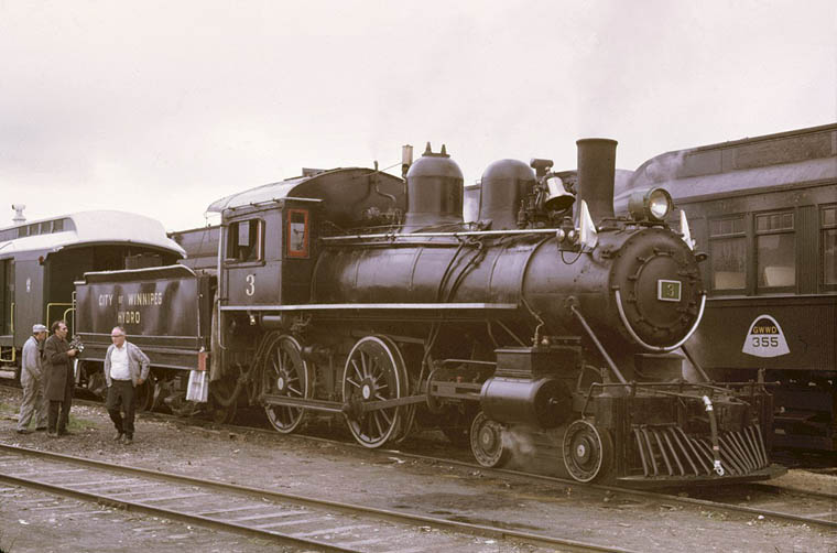 Built 4/1882 by Dubs & Co. Glasgow, Scotland. Rebuilt CPR 7/1909 City of Winnipeg Hydro 3 at the Greater Winnipeg Water District railway after recently being relocated there from its isolated line at Pointe du Bois. Both are non-common carrier railways owned by the city of Winnipeg. c.1960's Vlad Kedrovsky. Number 3 would go on to fame hauling tourists on the Prairie Dog Central where it continues to operate.