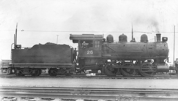 26, 0-6-0, (acq 6/1937 ex New York Central 6757), Rhode Island #41035 12/1906. Note: Inside admission valve gear. See photo of 22 above for another angle of 26.
