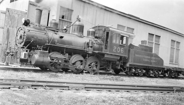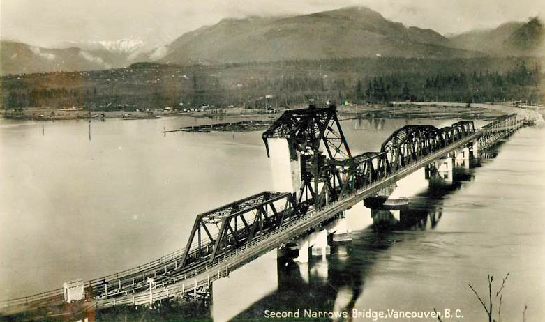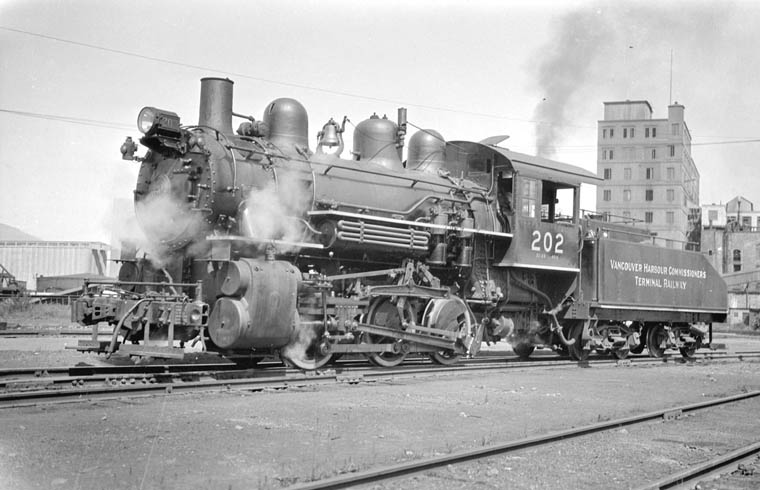 The Vancouver Harbour Commission Terminal Railway later became part of the National Harbours Board (which also operated in Montreal QC) and eventually was taken over by Canadian National January 1, 1953. The VHCTR operated on both sides of Burrard Inlet, crossing to North Vancouver on the first Second Narrows Bridge. This was a low road-rail bridge with level crossings at both ends! The southern end of the bridge had only a narrow piece of land between it and the CPR, itself pinned against a high bluff. As a result, the curve from west to north was quite a sharp one. John Picur