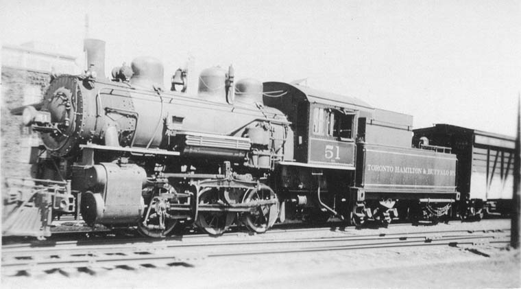 0-6-0 50 (above) and 51 (below) with stock car in Brantford. Note the pilot for road service from Hamilton. June 1932