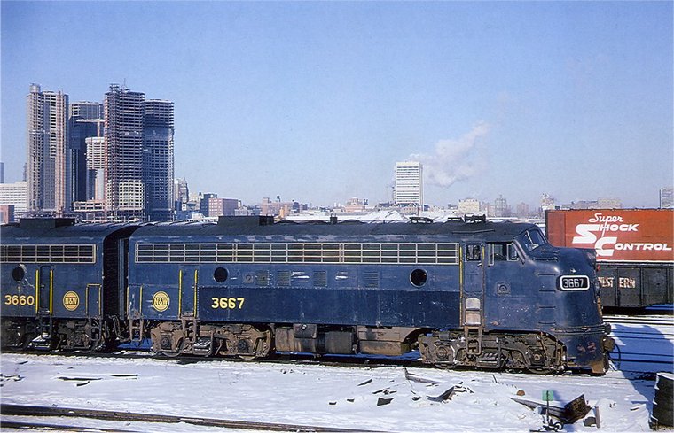 NW 3667_3660 sitting in Windsor with Detroit in the background. 8/1976 Byron Babbish