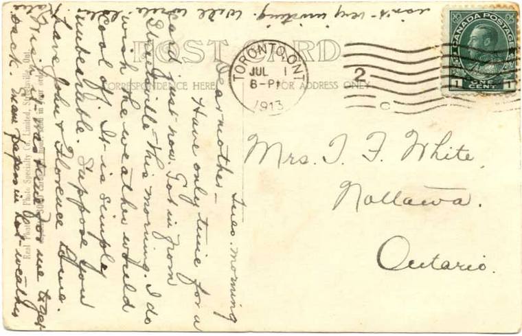 Old post card. An early form of e-mail! Collection of Doug Birchill Cancelled in Toronto 8pm July 1,1913 Tues. morning. Dear mother - Have only time for a card just now. Got in from Streetsville this morning. I do wish the weather would cool off. It is simply unbearable. Suppose you have John & Florence home. Wish it was time for me to get back (illegible) in hot weather isn't very inviting. Will write late. Katie.