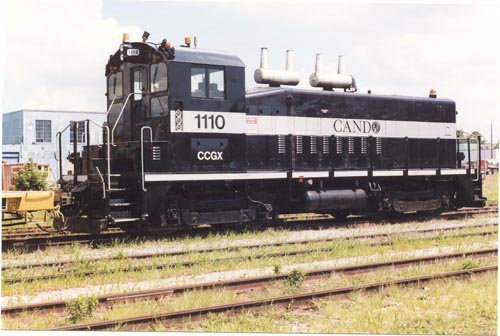 One of two units used on CANDO work trains was a GP9 originally built for the Quebec North Shore & Labrador as their number 157. It was later one of five units bought in 1981 by Metro Canada Ltd. of Kingston for a still-born commuter train operation between Vancouver and Coquitlam, British Columbia. These units were stored for some time at the CPR's John Street shop before going to the ONR at North Bay and eventually sold off to Andrew Merrilees Ltd. (Dealer). Acquired in August 2001, it became CCGX 1000, later going to Barrie-Collingwood Ry. and eventually wound up operating on the Orangeville-Brampton Ry. Note: When QNS&L disposed of most of their GP's beginning in 1970, many went to a new leasing outfit (said to be some CPR officials) named Canadian Bellequip Ltd. which in turn leased them to the C.P.R. A few months later they were all sold to Precision National Corp. a U.S. locomotive leasing company.