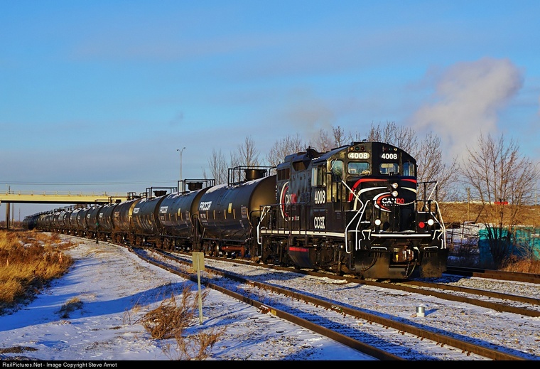 CCGX 4014 with a long train of tank cars in the siding at East Edmonton has just got a clearance to head south on CN's Camrose Sub. CN sets out empties in East Edmonton, CANDO takes them south to their own yard in Strathcona County at about mileage 10 to store empties for the refinery which CANDO then delivers as required. 6/26/2013 Steve Arnot