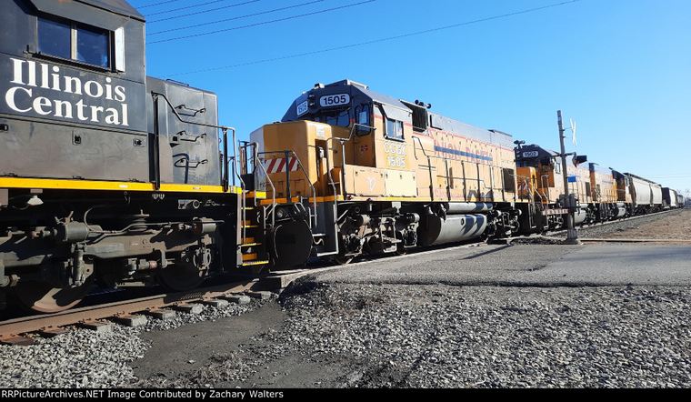 CCGX 1505 with 1502 and likely 1504 trailing. Effingham, IL 2/20/2022 CCGX 1505 ex UPY 743, ex UP 1743, nee MP 1743 EMD 827016-29 12/1982 4210-4216 All ex GMTX GP38-2 Acq. e/2022