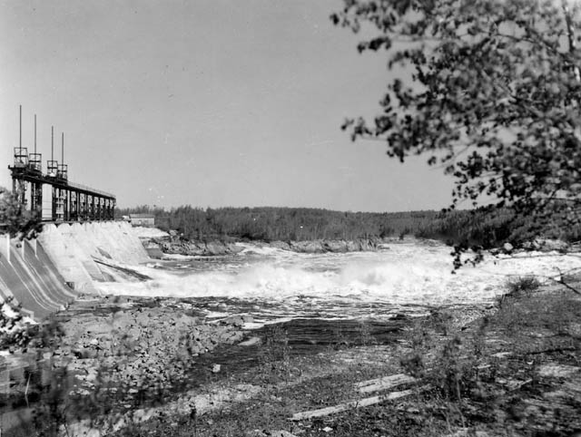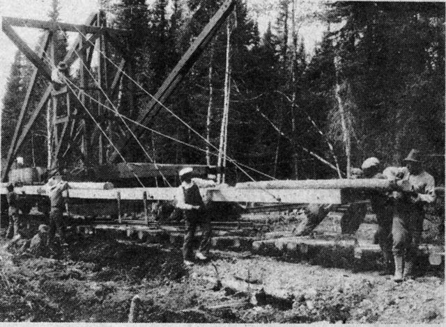 Track laying, 1926. The line was built with 67 ½ and 85 pound rail and ballast from an on-line pit. In 1922 the sulphite mill began production with 500 employees, with a capacity of 115 tons of pulp per day. The New York Times bought 49 per cent of the stock and an expansion followed in 1927 to open a four machine newsprint mill and hydro-electric power plant of 75,000 hp capacity that ensured its success.