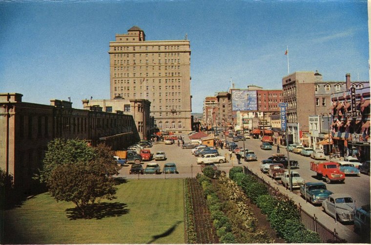 9th Avenue. CPR station at left with CPR Palliser Hotel in background.