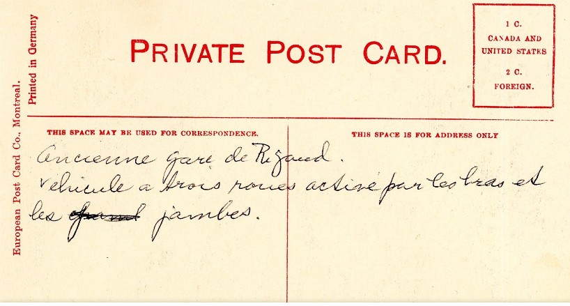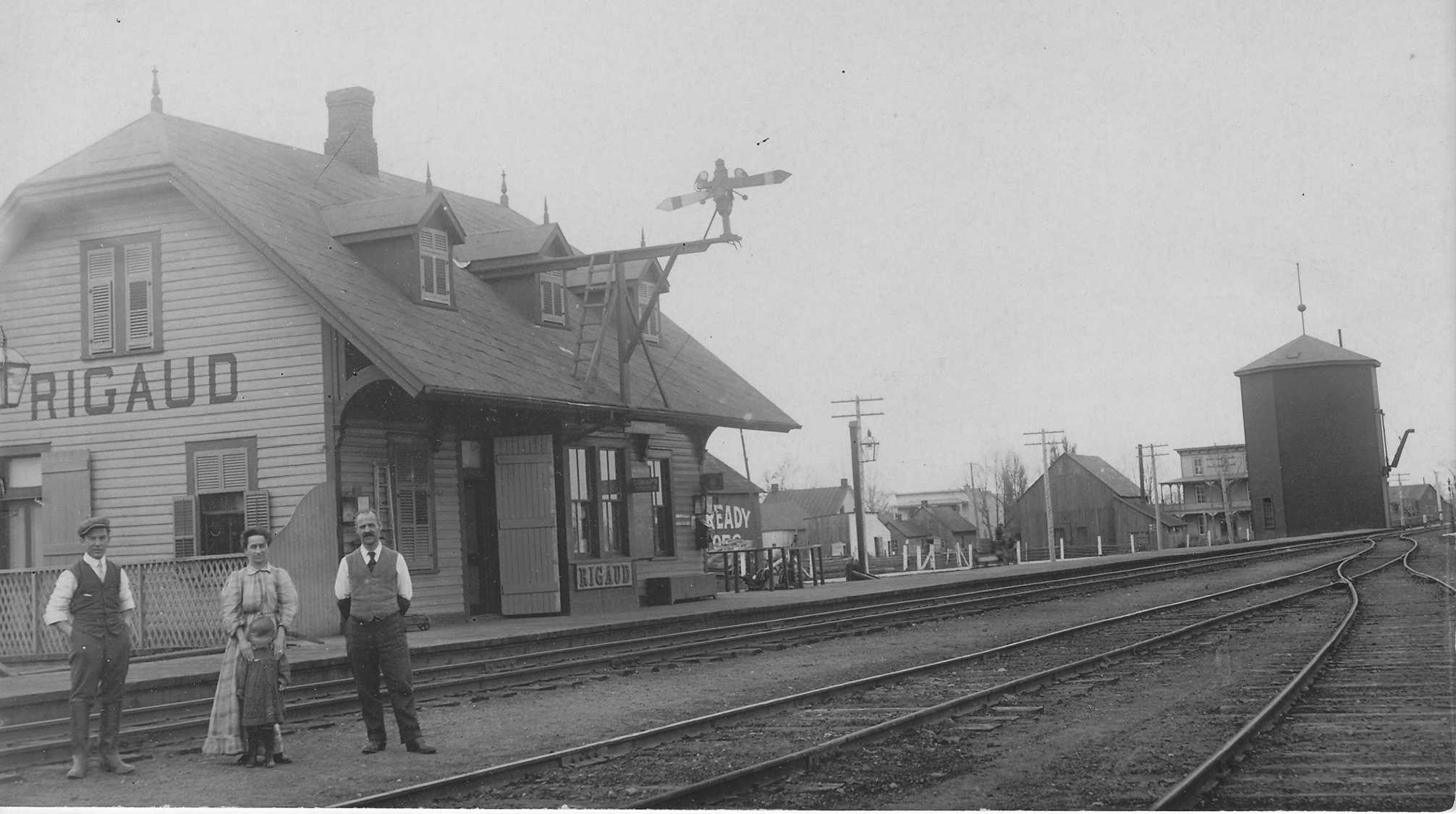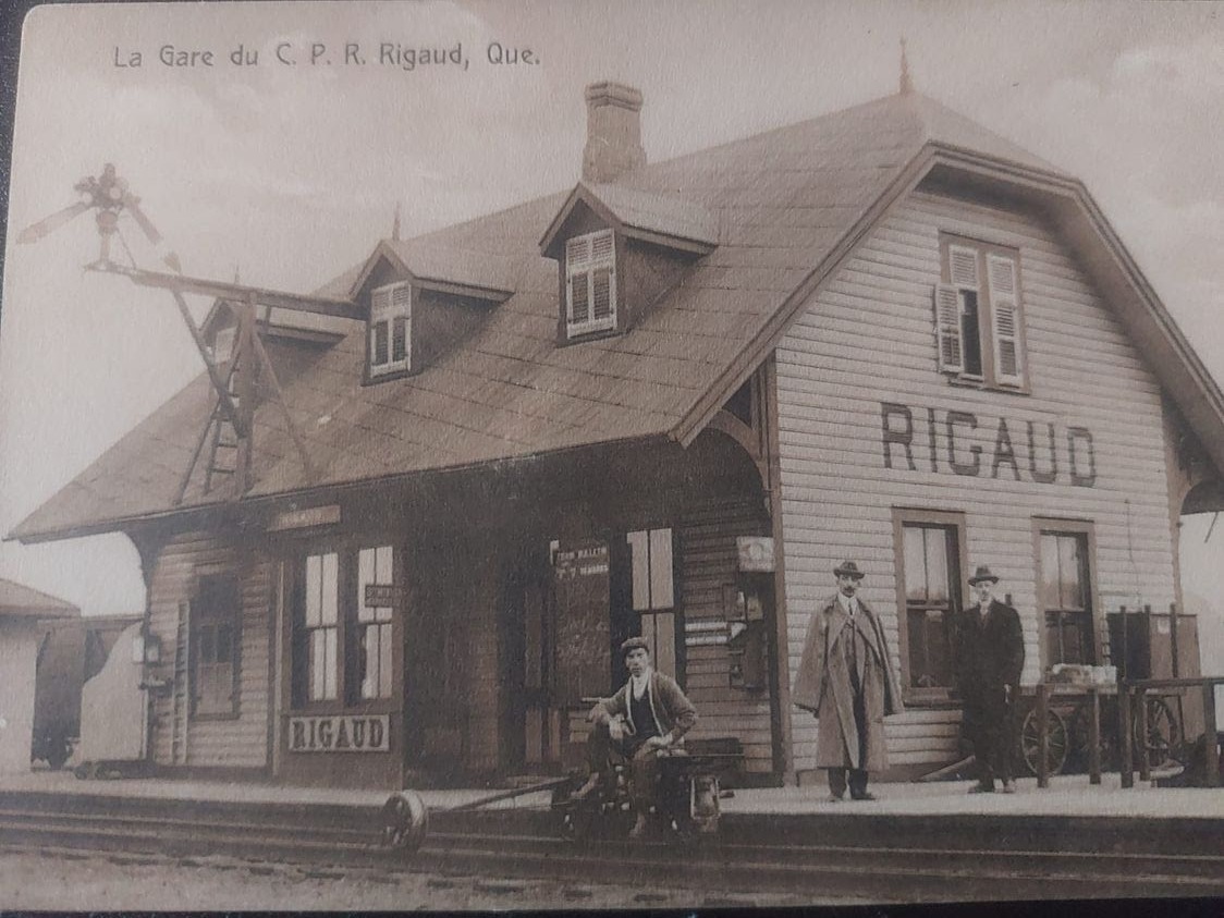 Rigaud. Circa 1910 post card. Man is sitting on a velocipede! Nearby is a typical water tower. Note the old style train order boards both indicating no orders either