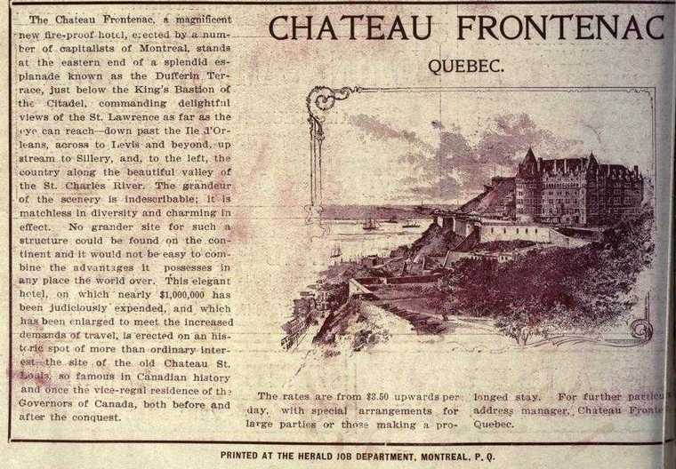 Chateau Frontenac Quebec City. Opened by CPR 1893. Rod and Gun in Canada
