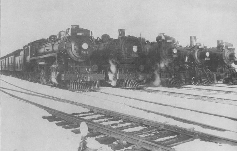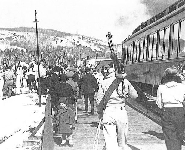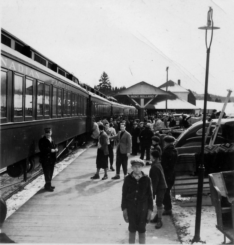 Downhill skiing on Laurentian Mountains was popular for decades throughout the steam era requiring many trains. Lineup of Passenger Extras waiting to take skiers back
