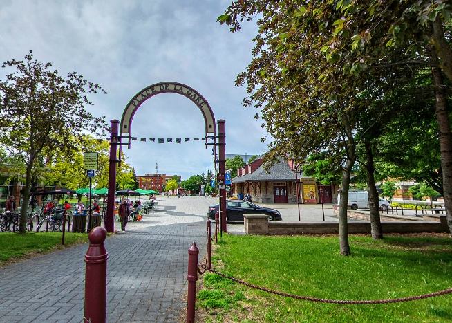 Entrance arch for Place de la Gare (Station Place) start of the trail. Station at right. Prevost July 26, 2007