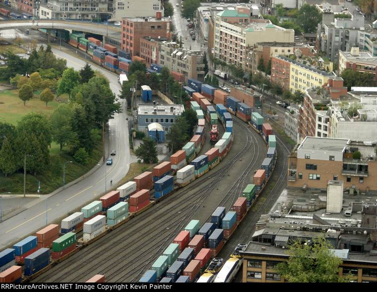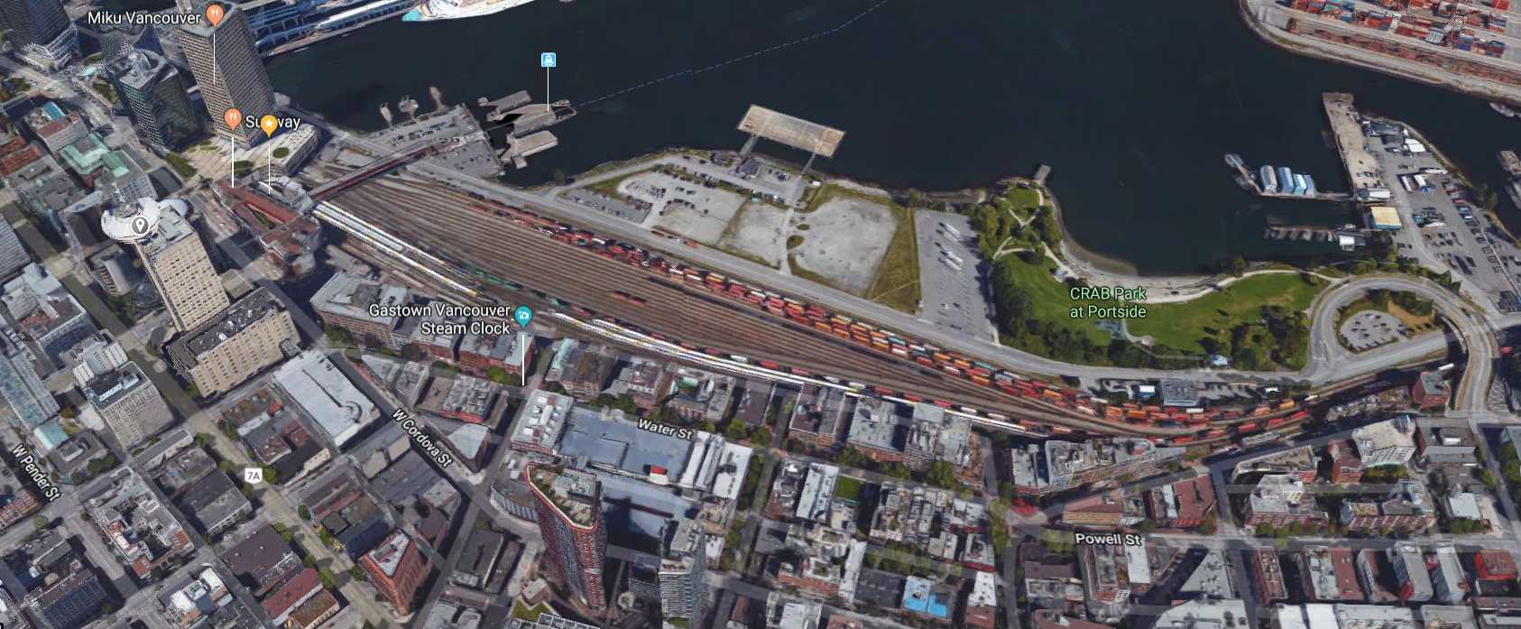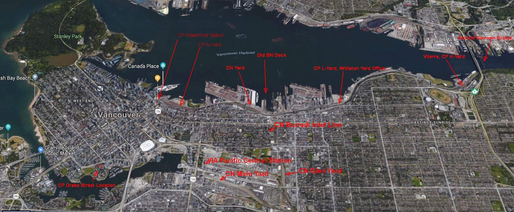 Waterfront area CP N-yard looking west. Note WCE trains bottom center. September 2, 2016 Aerial view Waterfront (Enlarge more click again) Aerial view closeup N-yard (Enlarge more click again) Drake Street roundhouse and coach yard. (Browser back to here)