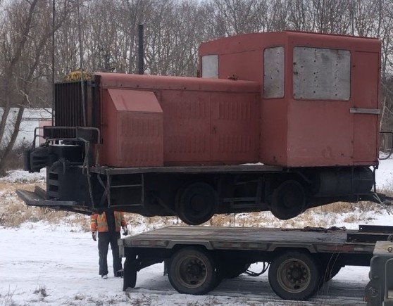 CNR 1521 being unloaded at its new home. Previously at Upper Clements Park, Clementsport, NB In service as yard switcher 1274 at Reddit, ON 1955.