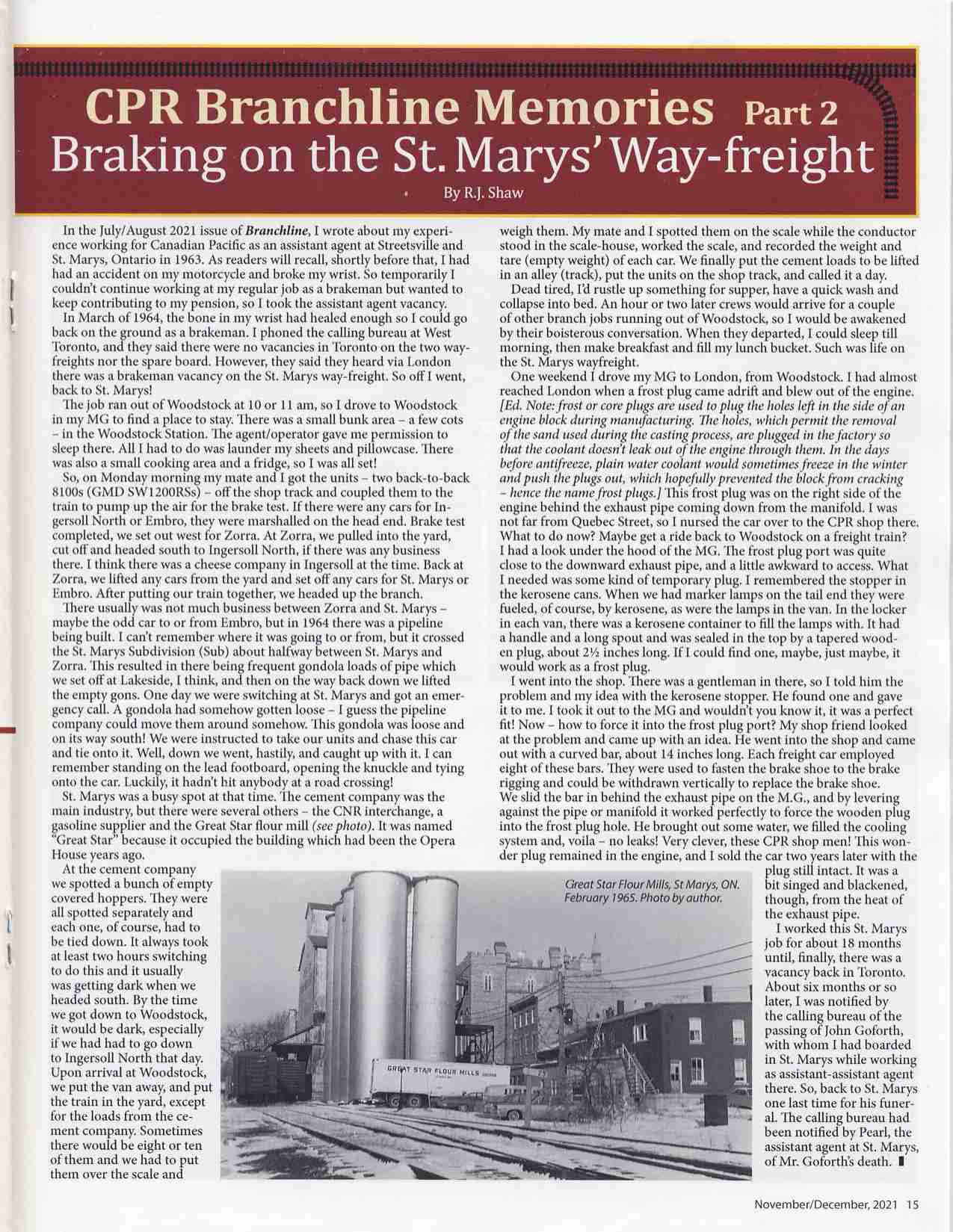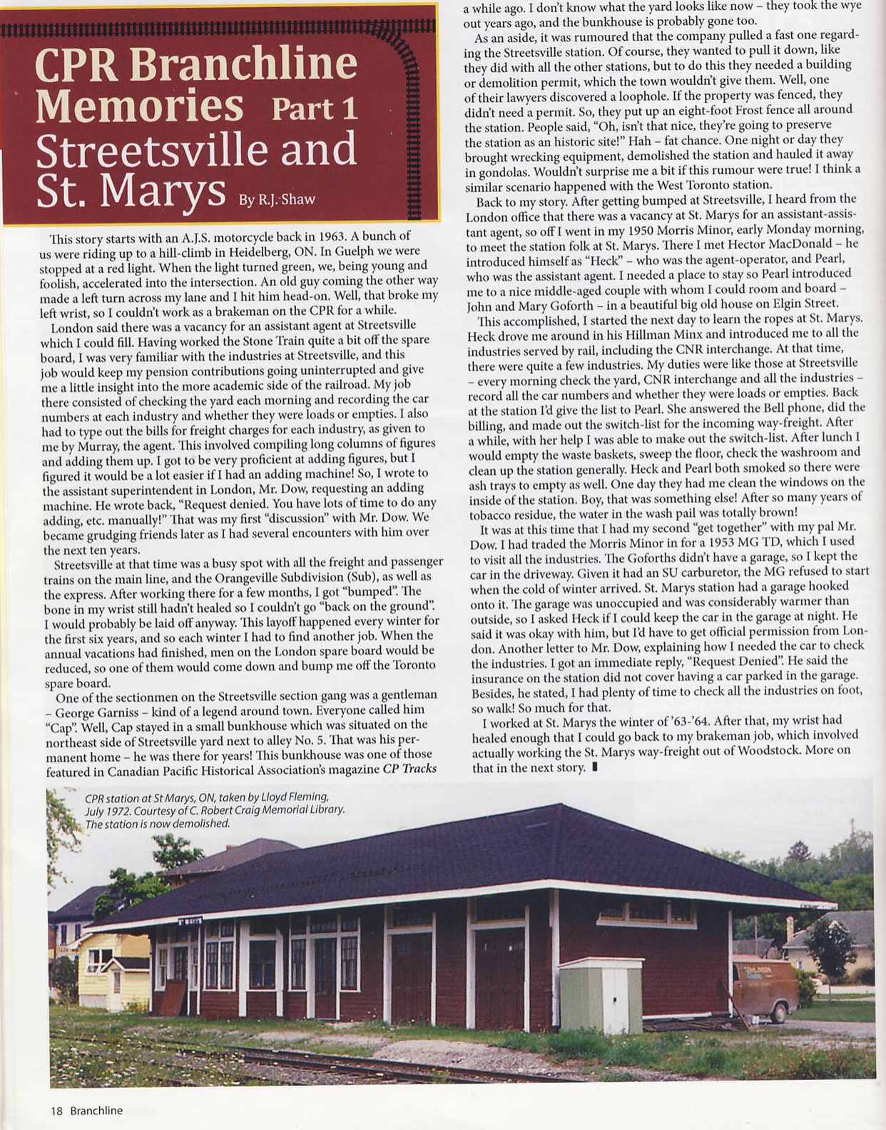 Memories of the Old K&P Robert Curry Station Agent's Stories Brief little stories by the late George McInnis a CPR station agent. 3510 at Ottawa West Personal story of a 10-year old boy riding a freight train. Bruce Chapman Braking on the Railroad Personal story about a 10 year old boy's railroad adventure. Al Howlett A Rolling Stone Gathers No Moss Personal story about a 10 year old boy's adventures. Al Howlett The Paper Boy Personal story about being a paper boy and the LE&N in 1943. Al Howlett Taking the Red Eye Home. Snow Storm of January 1918 Paralyzed Wellington County in Ontario. Steve Thorning Older memories of Drake Street, Vancouver by Andy Cassidy who previously wrote his Memories. Memories of the old K&P by new contributor Robert Curry. His grandfather William Curry was a CPR engineer on what had been the Kingston and Pembroke. Memories of Ottawa West by Bruce Chapman whose uncle Ben Huntington was a CPR engineer. Memories of Parry Sound Cliff Beagan recalls similar memories to those of Bill Chester's in Lucknow. After his railroading years he bought a local creamery and dairy operation! Former CPR brakeman Cliff Beagan is back with some more of his Memories of railroading in the 1950's on the Bruce Division. Port Mc.Nicoll grain trains, Snow plowing on the branch, Cattle on the Tracks , Buried Treasure, and Cinders in your eye. Memories of Riding Behind a Jubilee by Peter Cox. An old photograph brings back memories. Memories of Drake Street roundhouse in Vancouver by Andy Cassidy one-time diesel electrician and later Locomotive Foreman. Memories of Growing Up in Lucknow by Bill Chester. Typical small town. Memories of Grain Trains on the CPR Bruce Division. by Cliff Beagan. Memories of a Close Call at Christmas Time another story by Don Gaw about a near disastrous situation when a crew got careless. Memories of a Close Meet with a Ghost Train. A story by Don Gaw about an excited crew! Memories of an E-8 Story by now-deceased CPR conductor Don Gaw about one of the E-8 diesels on a fast Montreal to Ottawa passenger train that lost a wheel! The Last Days of Steam (link) Stories of A.B.Peden CNR brakeman Winnipeg 1951 Turning Back the Pages of the Tattered Little Note Book. New contributor Bruce Mercer writes about his early railroad career working as an engineer on the C&O in Ontario in the 1980's. CPR Chipman-Norton NB Last steam men working with trio of 4-4-0's reminisce about their days of branchline railroading in New Brunswick. Horseshoe Curve Wreck Famous wreck on the former narrow gauge Toronto, Grey & Bruce in the Caledon Hills area of Ontario. Ashdown cars Story about some old wooden box cars given a new purpose; to keep one of the hottest trains on the CPR rolling on time. Designed by Lambton Yardmaster Sam Ashdown. Waldorf Transfer Co. Hamilton,