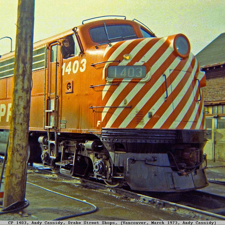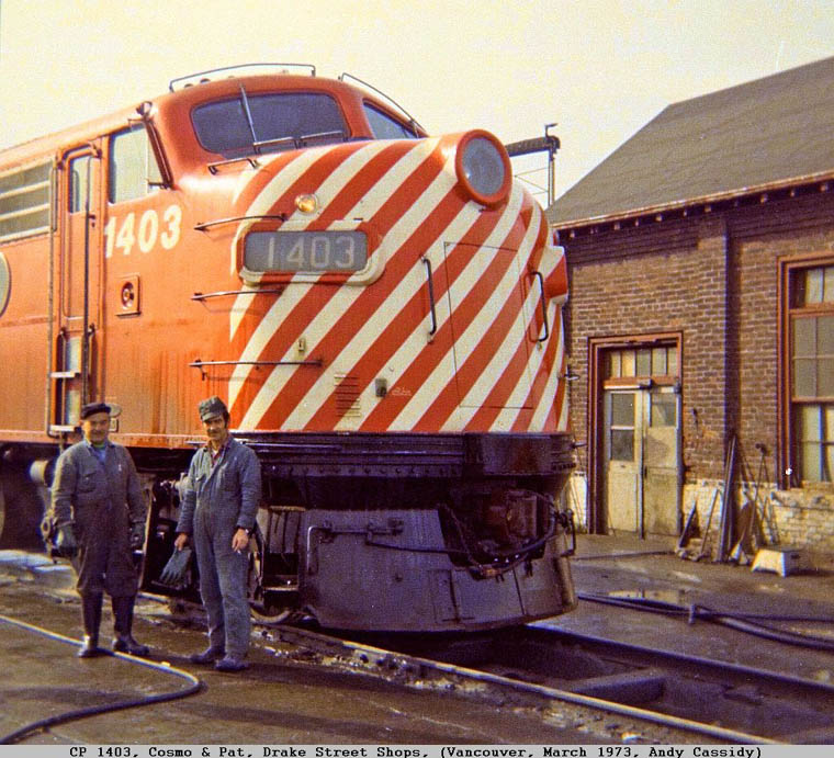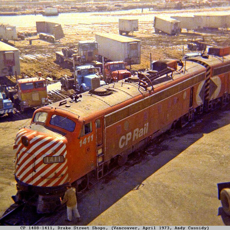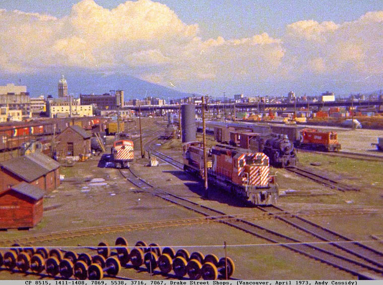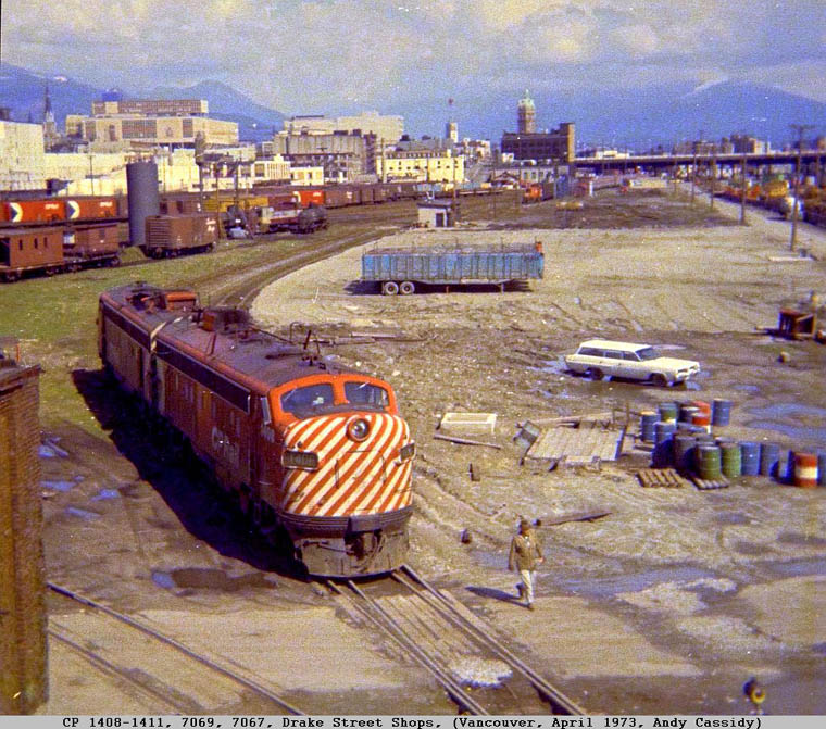 In the second photo Im looking right down on top of the CP 1411. Im standing on the south portion of the roundhouse roof where CP Transport ran their truck repair operation. You can see a number of their trucks sitting in the muck south-ish from the track that runs over to the Coach Yard. In the background you can see some log booms sitting in False Creek awaiting their turn in a nearby lumber mill. Im sure all the Yuppies who live in the current high priced condos around False Creek would be horrified to see it like it was then. In many ways I like it better the way it was there. Check out the Dynamic Brake grid blower just behind the cab on the roof of the CP 1411. Something the CN folks didnt have the benefit of. Also to note are the icicle breakers on the roof of both units.