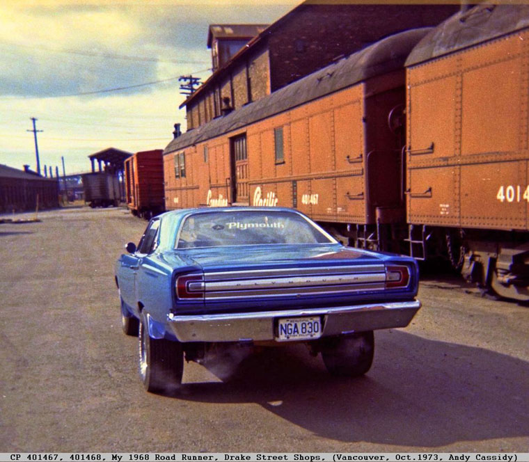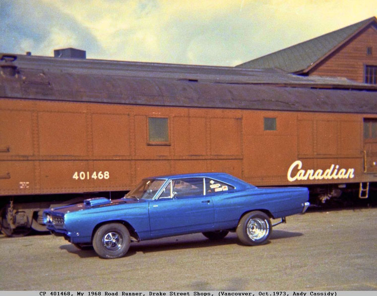 On this nice sunny day in October 1973 I got a few shots in the parking area of the old Baggage-Express cars CP 401467 and 401468 sitting on the Stores Track. Im not sure if at this time they were being used by the Stores Dept. or the Maintenance Of Way as tool/supply cars. In any event, sorry for the obstructed view here. For some reason my car was in the way of some great shots (1968 Road Runner. Angie Grafos said it sounded like a Fairbanks rolling in ) LOL!