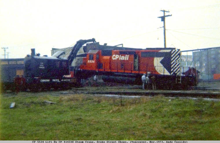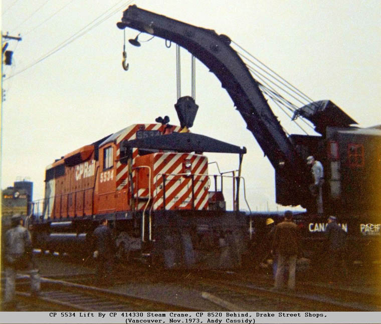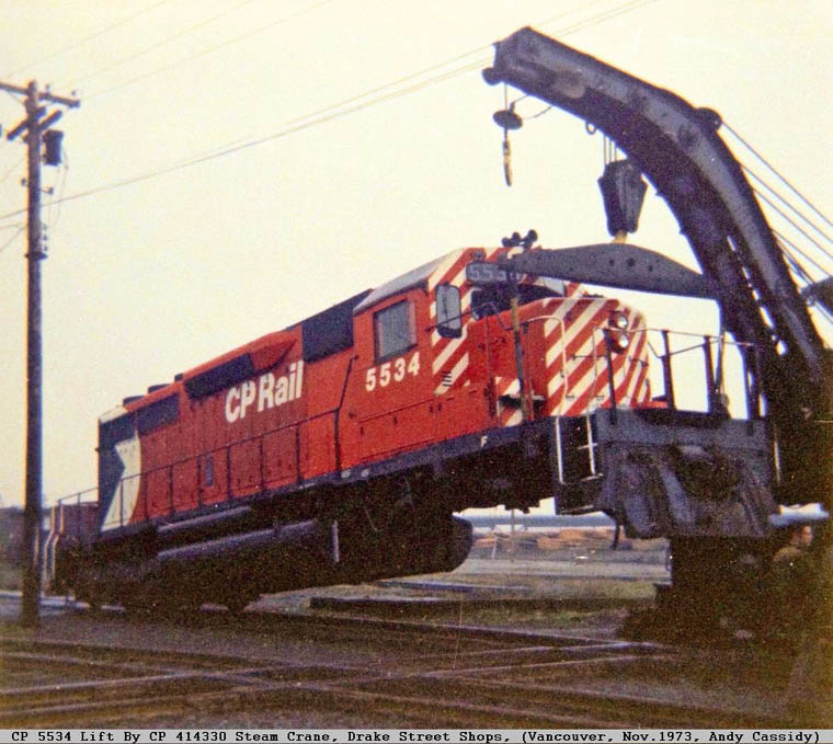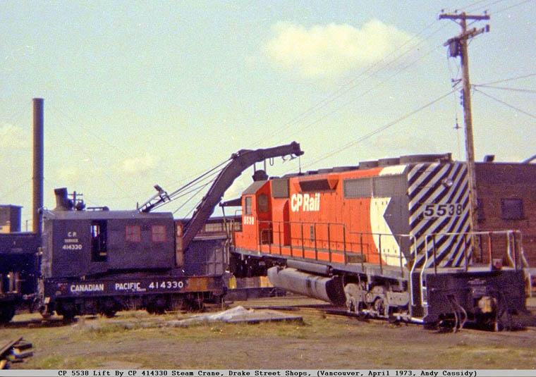 In the last set we saw the CP 5534 being lifted by the local Steam Crane CP 414330. Although those shots were taken in November of 1973, I showed those first because they gave a complete overview of the task at hand. That being the removal of a truck from an SD40 so repairs could be made to one of the Traction Moto/Wheel Combos. Back to April 1973 and here we have a couple of shots of the CP 5538 being lifted in the same manor, and for the same reason. However, at this time I was under the watchful eye of Labour Foreman Angie Grafos, and couldnt be hanging around taking pictures when there was other work to be done. Consequently, I only got the two attached shots of this lift. Too bad, because the lighting was 100% better, and so are the shots from the old Instamatic!