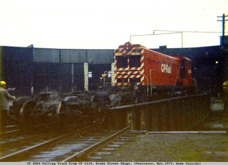 That task out of the way, the Carmen lifted the unit up clear of the truck. Then Angie Grafos brought the CP 8004 off the turntable up close to the CP 5534 on the other side of the crossing. The ground crew hooked cables between the 8004 and the truck under the 5534 so Angie could pull it out and onto the turntable. Once there they turned the table to line up with pit #12 and put the truck inside so they could replace the motor and wheelset. Later they reversed the whole procedure and sent the SD40s on their merry ways.