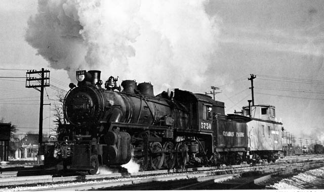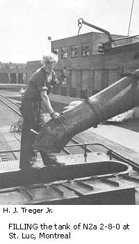 Motion and boiler: These were what bestowed on the steam locomotive its reputation for high and labor intensive maintenance. Since all of the maintenance was mandatory on every engine, every day was scheduled for some of this routine, arranged as best you were able. Yes, and a daily examination of each smokebox netting had to be made by a boilermaker, and the engine-truck journal cellars had to be repacked by a helper. You were always aware of the flange condition, especially of the leading wheels, on your power, If you weren't, a government inspector might be. Blowing piston rings and piston rod packing were reported by engineers. Crosshead shoes were watched by you or by the fitters, generally to be fixed at washout time, when an engine was available for hours. From time to time, you could work in a Class 3 repair, which could tie up an engine for weeks if your men were needed elsewhere. Your days now and then were enlivened by the breaking of a water glass and the essential but uncomfortable task of shutting off the gauge cocks so you could get the water glass replaced; or by the problem of how to dispatch 14 engines in the forenoon while your turntable was out of action for its own heavy, repairs (this just took planning). Your turntable was old, like everything else, and often required running repairs from your airbrake man, the only pneumatic authority on the property. Passenger trains were sacred and always had to be protected by a backup engine; this called for careful assignment of power and accounted for its apparent underutilization. You could usually get a passenger engine washed out and well maintained in the period between daily assignments, unless it was a real troublemaker. The company liked its passenger engines to look like passenger engines, which meant special attention from laborers, when you had them. Not all of the inspectors were as rigid as the Brit who used to run his gloved finger over the inside of driver spokes looking for grime but the 14-karat gold leaf had to be washed with Oakite, white walls on tires needed to look white, and side rods had to be buffed. Steam-locomotive grime was special and plentiful - a compound of coal dust and grease which dirtied overalls in two days if you climbed around much (as you were supposed to). Delays in servicing passenger trains that were running through could, you were confident, be explained by "'loading express," even though no express had been tendered there for 10 years. The dispatcher knew that too, but you were all playing the same game in the end; the General Manager likely was a player as well. And winter - winter on the glory road. Snowplow extras wore tarpaulins over cab and coalpile when they were out on the road; in the yard, two plows often went out back-to-back with the power between, up and down all the tracks as long as the snow was falling. Winter was the time to find where steam was leaking, a real menace if it was outside: frozen ashpans and ashpits, sand pipes and air reservoirs, turntables and coal chutes. There must never be frozen water spouts, though; and never, never frozen injectors or delivery pipes. Simple devices protected against those catastrophes, and the punishment for failure to use them was so terror-striking that Lubjanka would seem like Malibu. You liked new engines, but management was scrupulous in its distribution of such largesse and your share was minute. The effect of new engines on maintenance costs and peace of mind was as pronounced at your level of management as it was in the Boardroom. You grew familiar with trade names that were to disappear if they did not adapt to diesel: Franklin: Sunbeam: Okadee; Waugh; Elesco: Worthington: Hunt-Spiller: Nathan; Signal; Barco; Ragonnet; Valve Pilot: Cyclone: Baker-Pilliod; Hancock; Sellers. Good night. Standard Stoker wherever you arc! The steam engine was, among other things, a collection of patented devices specified by designers but seldom proprietary to the builder or to the owner. Antismoke laws came along to take another year or two off your life, what with needing special bits of piping to reduce smoke when lighting up (overfire air jets by another name). You had to monitor the bank firemen and the stationary firemen too, with Ringelman gauges. Pollution distaste is taken for granted now, but then it seemed a nuisance put upon you by a petty official at City Hall Would they rather see no smoke at all, from a deserted roundhouse full of laid-up power? Why, you were moving a nation's commerce; but people were beginning no longer to listen. Some boredom existed, as in the Army during the war: and you needed luck and the obliging help of friendly men who could cover up your minor failures just as you covered up theirs. Which was as in the Army. In fact, a day in the operation of a railroad was like a military operation, as Fortune once observed; and the discipline had similarities - sometimes thoughtless, harsh, even ridiculous, with some management performed by intimidation and fear. But not all of it; not even much of it. And there were incidents involving people, their eccentricities, personalities, habits, and strategies for pursuing the aims of their employers or themselves; some humor; and some head-shaking (then just as there undoubtedly is now). With the Canadian Pacific's diesel ownership limited thus far to a handful of yard engines (skepticism ruled most motive-power circles, and mainline power was unthinkable except on the Santa Fe and for a few streamlined trains), only a few sophisticated servicing facilities had been supplied. About the simplest way to fuel an engine was to call in a tank wagon from the local Shell distributor and have him fill the switcher on the crew's 20-minute lunch break. This method doubtless came at a high price per gallon but was a useful expedient in emergencies, especially at night.