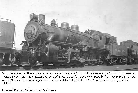CLICK HERE to see 5750 at Lambton, working the Parkdale Transfer, shown switching its own van to the other end of its train, the only switching transfers were required to do, making the Day Transfer a sought-after job for senior men. Use the BACK button to return here. |